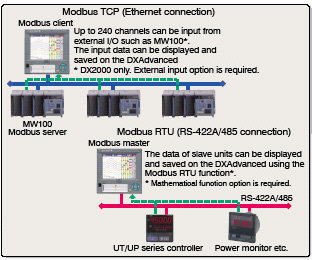 通過Modbus 協(xié)議可以讀取、寫入其它機(jī)器的測量數(shù)據(jù)。例如:利用Modbus/TCP功能把DAQMASTER MW100作為外部輸入設(shè)備連接,最大可以實(shí)現(xiàn)348通道的多點(diǎn)數(shù)據(jù)采集系統(tǒng)*。 * 需要擴(kuò)展通道功能選配件及運(yùn)算功能選配件。 | |