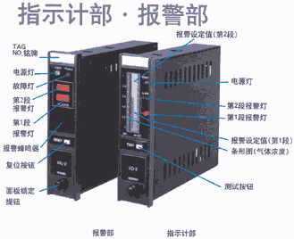 V系列指示計、報警部同各種氣體檢測探頭可組合成盤裝式和壁掛式氣體檢測報警系統(tǒng),可檢測可燃性氣體、毒性氣體和氧氣等。指示計的作用是向探頭供電的同時,接收并處理從探頭送回的信號,液晶條形水平線顯示氣體濃度。當(dāng)濃度超過報警設(shè)定值時,自動發(fā)出報警,并輸出接點信號和模擬信號,同時傳送至報警部;報警部的作用是接收指示計的報警信號發(fā)出聲光報警,同時向外部輸出接點信號。