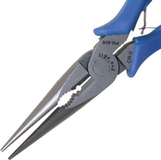 PM-909, 克鋼6"尖嘴鉗(170mm)藍(lán)色TPR手柄[電工剪鉗類] . 全長:170mm. 刀口硬度達(dá)HRC60°±2°. 省力偏芯設(shè)計(jì),并具 1.5mm剝線孔. 采用TPR防滑手柄、握感舒適,配合雙葉片彈簧、剪切省力