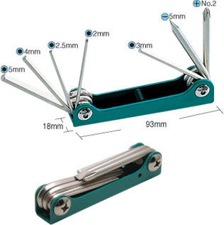 8PK-021S, 折疊型綜合扳手組(7支組)公制六 [六角扳手類]. 規(guī)格: 2,2.5,3,4,5,mm 5mm #2. 材質(zhì): SAE6150鉻釩鋼. 本體鍍鎳處理