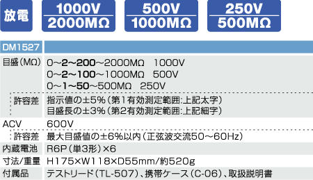 | 本器は定格電圧1000V、500V、250Vの印加電圧3レンジ式の絶縁抵抗計(jì)です。パワーオンとパワーロックが可能な2段式プッシュスイッチを採用。測定後、充電された電圧を放電するディスチャージ機(jī)能付きです。內(nèi)蔵電池の電池容量が簡単に測れるインナーバッテリチェック機(jī)能を搭載しました。 ● 耐衝撃デザイン ● 充電された電圧を放電するディスチャージ機(jī)能 ● パワーオンとパワーロックが可能な2段式プッシュスイッチ ● パワーオンがLEDで確認(rèn)できる高圧発生インジケータ ● インナーバッテリチェック機(jī)能 ● 活線狀況を見極められる交流電圧測定機(jī)能 ● 印加電圧3レンジ切換式 |