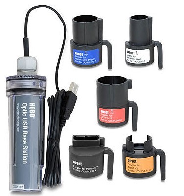 The new Universal Optic USB Base Station and a series of couplers are used to offload data from any HOBO® data logger with an Optic USB interface. The Optic USB Base Station connects to your computer via USB, while connecting to the logger via an appropriate coupler.