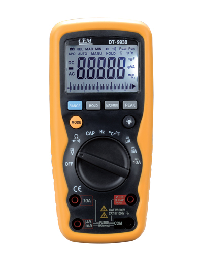 DT-9938具備安全外殼設計和IP67防塵防水功能,為更加安全的測量提供了保障. 這款表集合了精確度高、使用便捷,安全可靠的特點,符合CAT III 1000V和 CAT IV 600V IEC 61010 等安全指標. 根據瞬間脈沖的危險系數,IEC 61010 安全指標分為四種類型 (CAT I 到 IV). CAT III 類型的表筆適用于通常的電壓等級要求不是很高的設備的測量; CAT IV 類型的表筆適用于室外電壓等級要求較高的測量(如高空或地下設施)